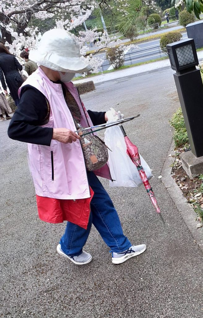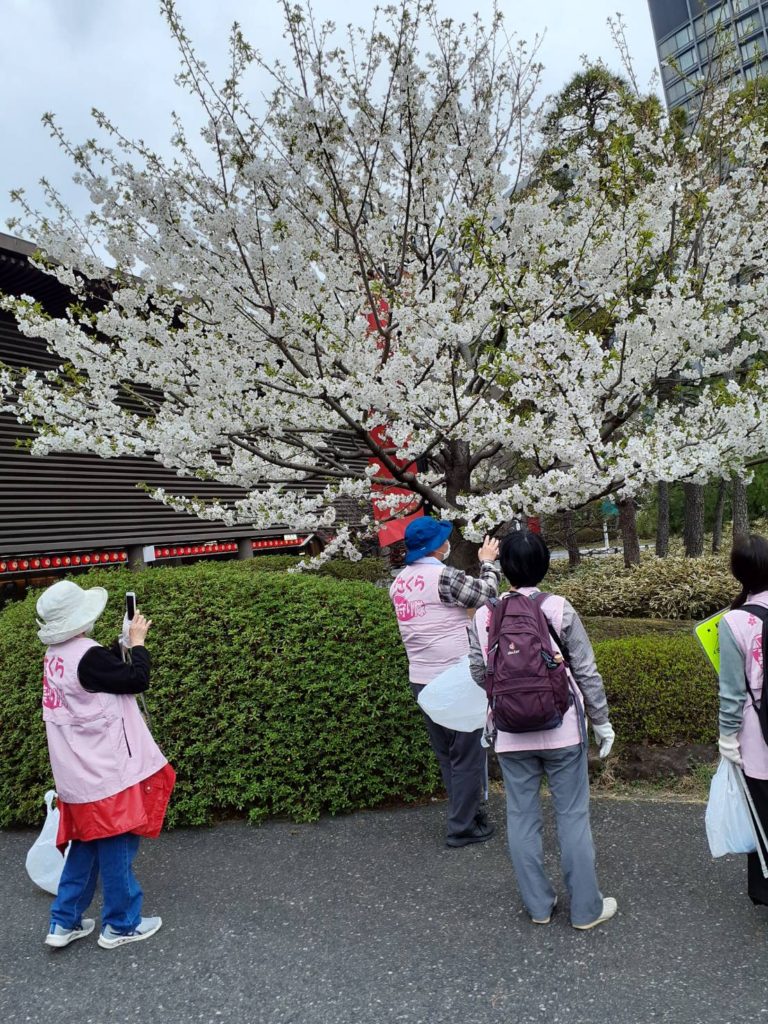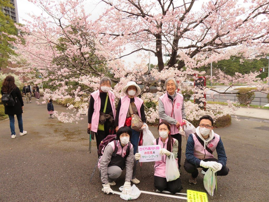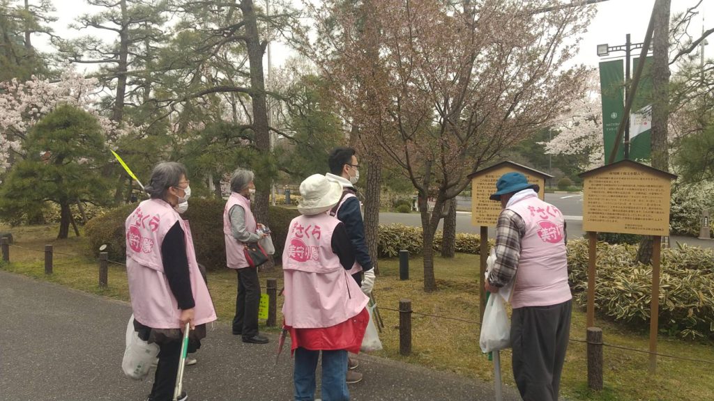 心配しながらも小雨決行で臨んだ、お花見&クリーンアップ。お花見しながらゴミ拾いをして歩こうというイベント。ボランティア参加者4名、美守り隊4名で、まずは、三春の滝桜を往復し、千鳥ヶ淵緑道と側道を通って、内堀通りへ出て南下、千鳥ヶ淵公園の舞姫桜(咲き始め)、半蔵門交番前の山桜(見頃)などを見ながら、国立劇場へ。国立劇場は、神代曙、小松乙女、駿河桜、駿河小町などが見頃。牧野富太郎が名付けた、仙台屋(山桜)が咲き始め、熊谷桜は散り終わり、でも枝先に数輪残っていました。